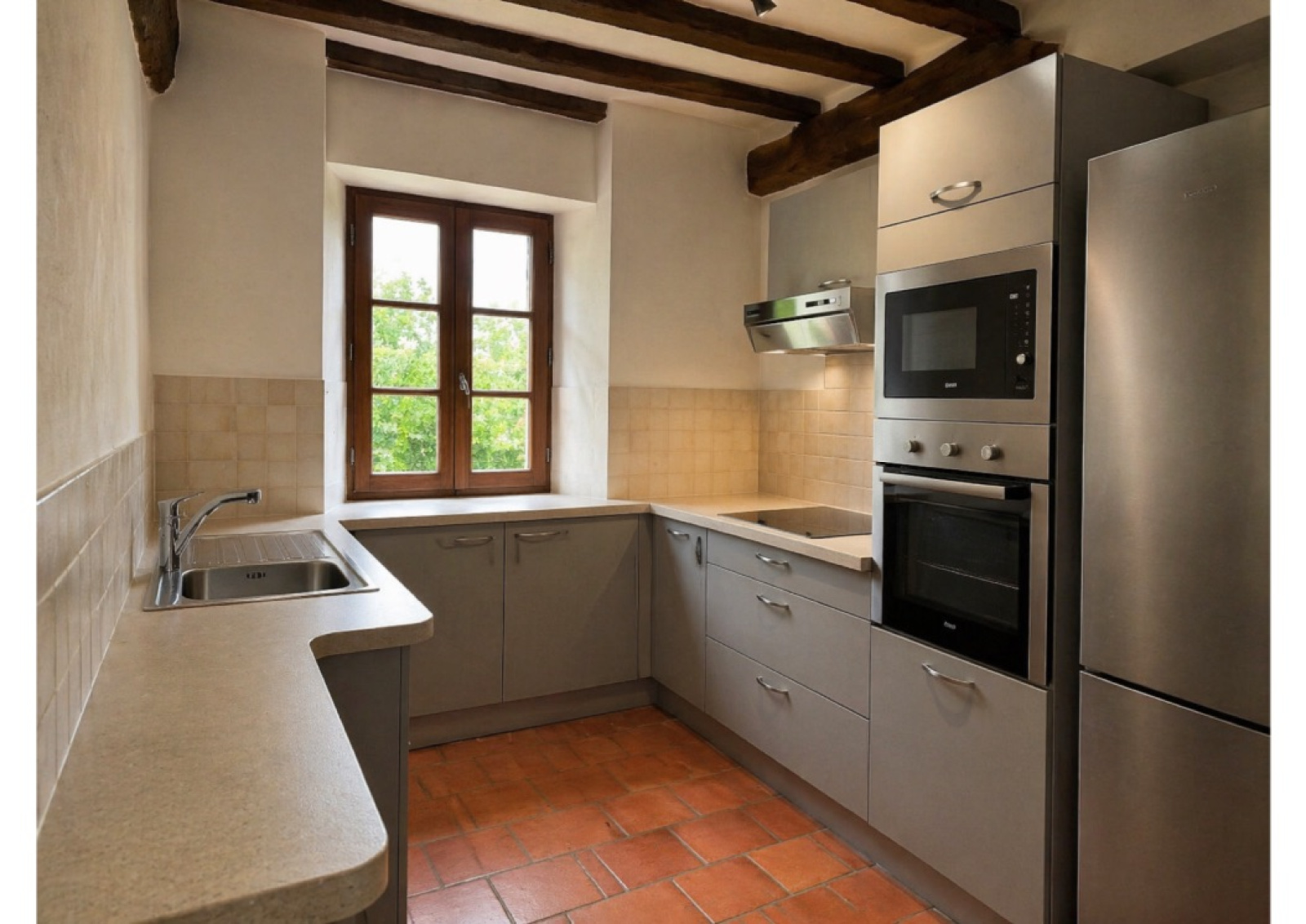 En partie aménagée, évier, hotte, four électrique, four micro-onde, plaque induction, lave vaisselle.