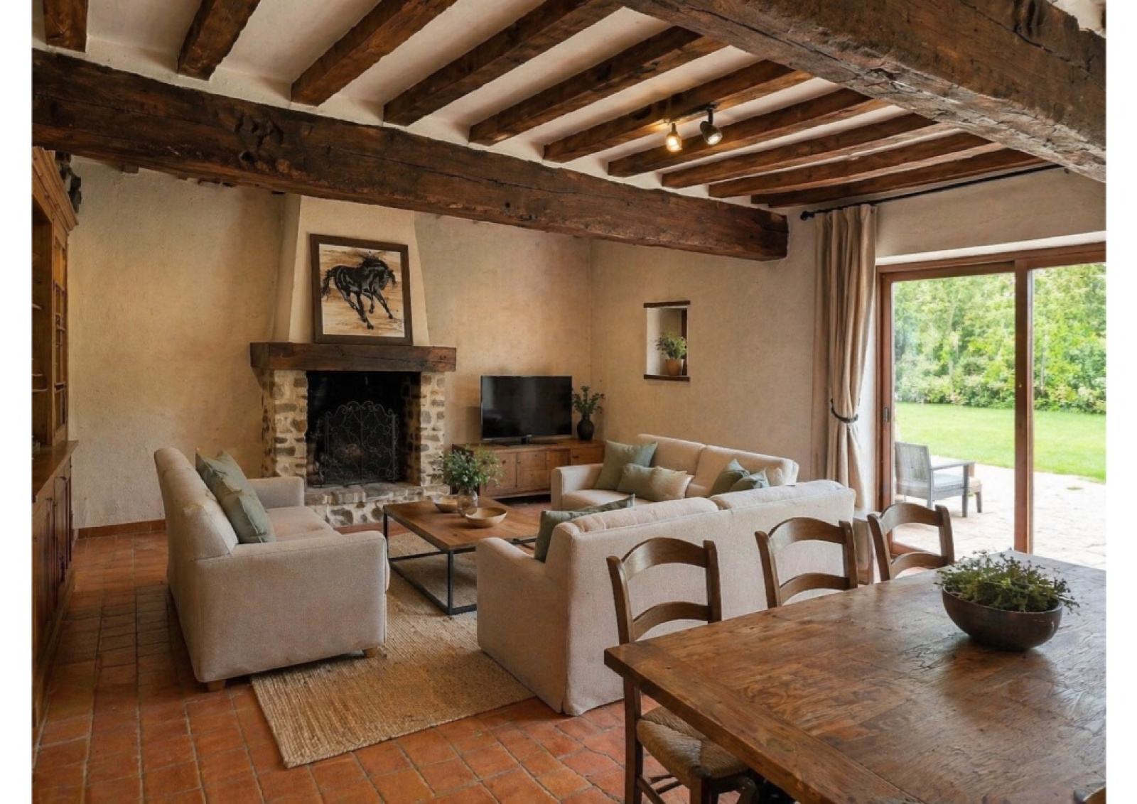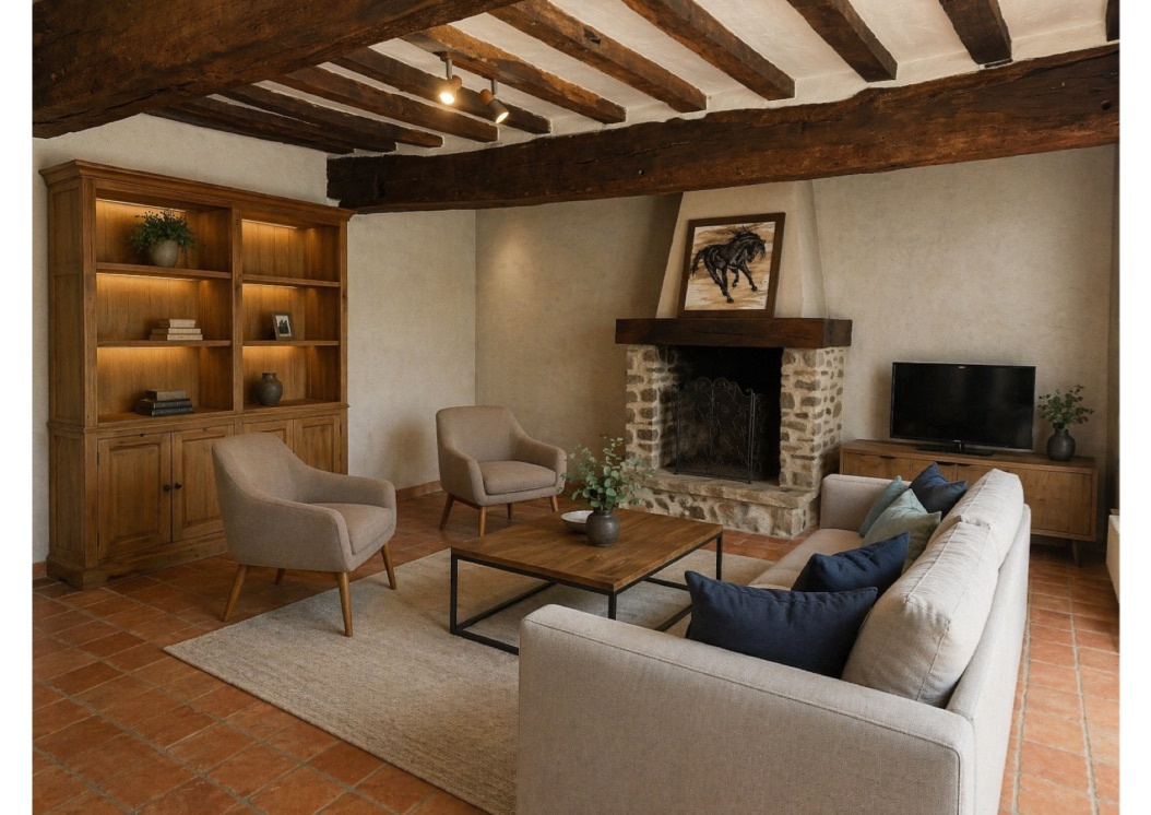 - une entrée ouvrant sur un salon-séjour chaleureux avec une grande cheminée ouverte,