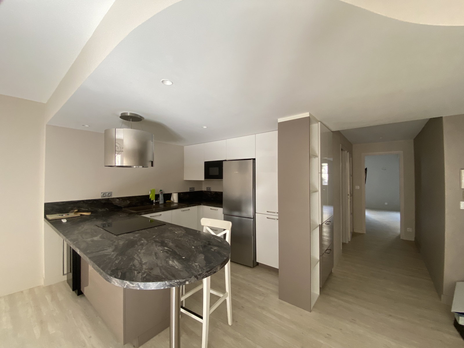 Equipement: plaque de cuisson induction, four, hotte aspirante, réfrigérateur, micro onde, cave à vin.